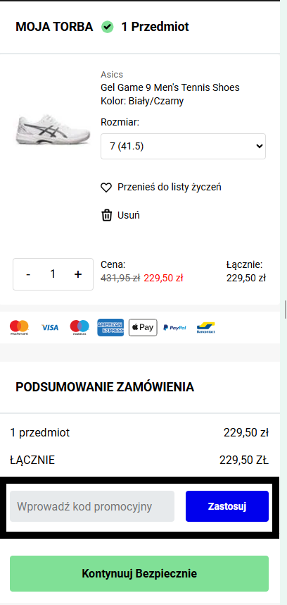 Jeśli korzystasz z kodu promocyjnego, który jest obecnie dostępny na naszej stronie internetowej, można go dodać do "koszyka". Wystarczy wpisać kod promocyjny w polu pod "całkowitą" kwotą zamówienia, a następnie wybrać opcję "Zastosuj".