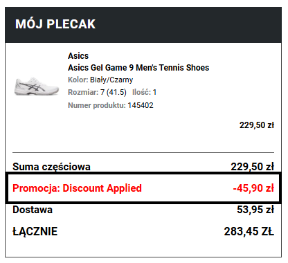 Jeśli zamówienie spełnia wymagania dotyczące kodu, rabat zostanie zastosowany do zamówienia i będzie widoczny w "podsumowaniu zamówienia":