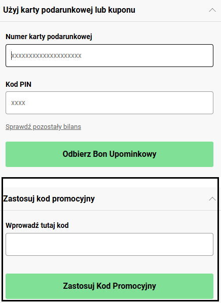 Po wybraniu opcji dostawy zostaną wyświetlone wszystkie dostępne opcje płatności za zamówienie. Wybierz opcję "Zastosuj kod promocyjny", wprowadź podany kod, a następnie wybierz opcję "Zastosuj".